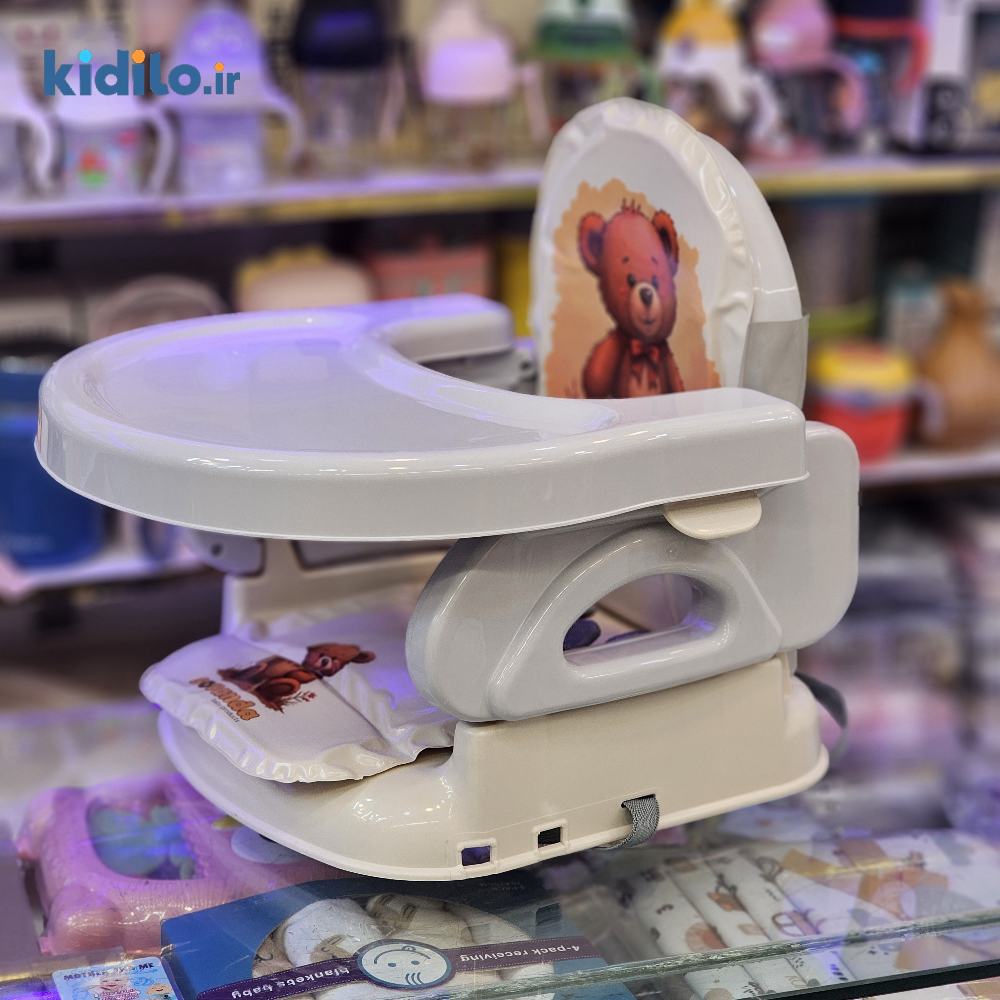 صندلی غذای کودک مدل پرتابل + کاسه و قاشق رایگان با تشک نرم عروسکی سواندا Suvanda (طوسی تدی)